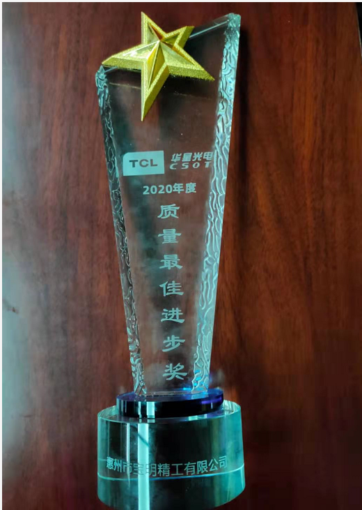 2021年3月10日在華星光電2020年優(yōu)秀供應(yīng)商表彰活動中,寶明榮獲 “質(zhì)量最佳進步獎”。并獲頒獎杯。